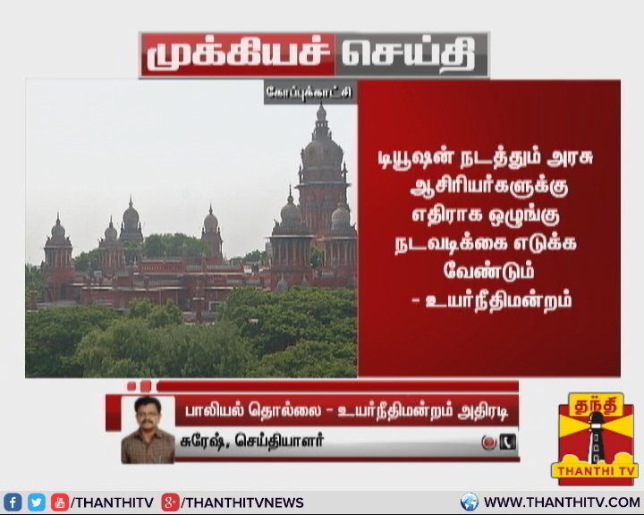 டியூஷன் நடத்தும் அரசு ஆசிரியர்களுக்கு எதிராக ஒழுங்கு நடவடிக்கை எடுக்க வேண்டும் - உயர்நீதிமன்றம்/அனைத்து பள்ளிகளுக்கும் சுற்றறிக்கை அனுப்ப வேண்டும் எனவும் உயர்நீதிமன்றம் உத்தரவு